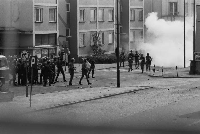 Rynek (wówczas pl. Wolności). Oddziały ZOMO usiłują odepchnąć ludzi w głąb ul. Odrodzenia. |